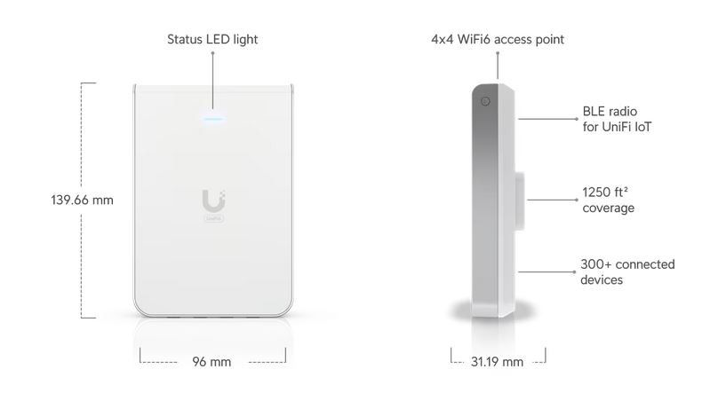 Ubiquiti U6-IW to punkt dostępowy przystosowany do pracy pod kontrolą systemu UniFi. Wspiera standard Wi-Fi 6, może transmitować sieć bezprzewodową w pasmach 2,4 i 5 GHz jednocześnie. Wykorzystuje protokoły IEEE 802.11 b/g/n/ax w paśmie 2,4 GHz i IEEE 802.11 a/n/ac/ax w 5 GHz. Maksymalna teoretyczna przepustowość połączenia bezprzewodowego wynosi 573,5 Mb/s w 2,4 GHz oraz 4800 Mb/s w 5 GHz. Posiada 1 gigabitowy port Ethernet, który służy jednocześnie za wejście zasilania PoE oraz 4 gigabitowe porty LAN. Pierwszy z nich może także służyć jako wyjście zasilania PoE. Montaż naścienny, na puszce elektrycznej. Umożliwia stworzenie do 8 sieci (8 BSSID) oraz podłączenie maksymalnie 300 klientów jednocześnie.