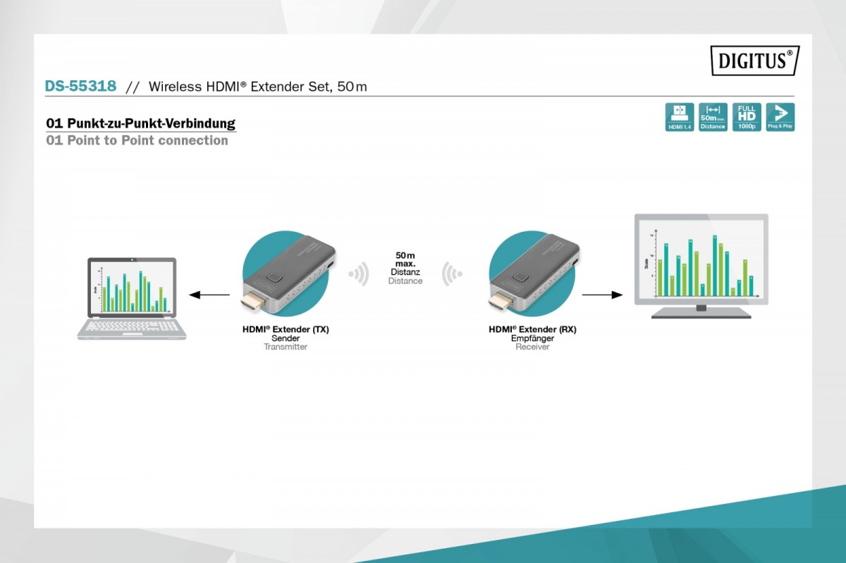 Przesyłanie multimediów: Zestaw extendera HDMI DIGITUS, który opiera się na technologii radiowej, przesyła bezprzewodowo sygnały audio i wideo w jakości full HD (1080p/60 Hz)