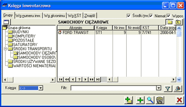 Podstawą ewidencji danych są księgi inwentarzowe zorganizowane w wielopoziomową strukturę drzewiastą. Środek trwały może należeć do wielu grup nadrzędnych, przy czym ma jednoznacznie określoną grupę KŚT. Mechanizm dziedziczenia cech jest realizowany podobnie jak w kartotekach towarowej i kontrahentów. Ewidencja wszystkich zdarzeń związanych ze środkami trwałymi odbywa się w oparciu o stosowne dokumenty, a więc dokumenty przyjęcia, likwidacji, oddania do remontu, zmiany osoby materialnie odpowiedzialnej za środek trwały, przeszacowania środków trwałych i innych.