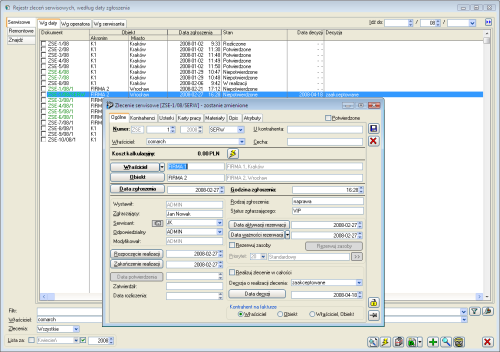 Ewidencja zdarzeń serwisowych lub remontowych odbywa się za pomocą odpowiednich zleceń. Zlecenie remontowe pozwala dodatkowo na przyjęcie remontowanego urządzenie do magazynu remontowego w firmie oraz obsługę wymiany wraz z uwzględnieniem ew. gwarancji.