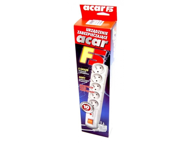 Acar F5 to zabezpieczenie przeciwprzepięciowe pięciu urządzeń. Podświetlany wyłącznik, wygodny automatyczny bezpiecznik, cztery możliwe kierunki ułożenia sznura sieciowego, estetyczne wzornictwo, konstrukcja z wysokiej jakości niepalnego tworzywa, szybkie warystory, a także 10 letnia gwarancja oraz niska cena gwarantują najbardziej trafny wybór do biura i domu.