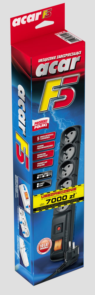 Acar F5 to zabezpieczenie przeciwprzepięciowe pięciu urządzeń. Podświetlany wyłącznik, wygodny automatyczny bezpiecznik, cztery możliwe kierunki ułożenia sznura sieciowego, estetyczne wzornictwo, konstrukcja z wysokiej jakości niepalnego tworzywa, szybkie warystory, a także 10 letnia gwarancja oraz niska cena gwarantują najbardziej trafny wybór do biura i domu.