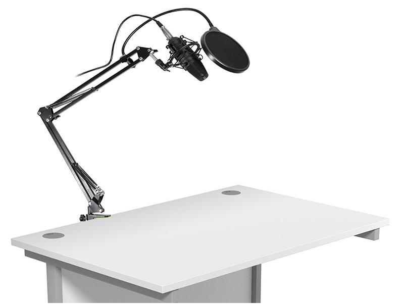 • Statyw –Bezpiecznie i stabilnie bez huśtania się. Konstrukcja stalowa z podwójnym ramieniem. Maksymalna obciążalność 2,5 kg, długość ramion 40 cm. Wyposażony w gwint 6,25 mm (5/8”), pasuje też do mikrofonów Blue Yeti, Blue Snowball.