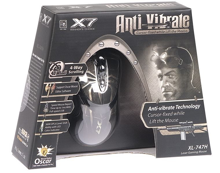 Najnowsza mysz z serii A4Tech XGame dla graczy wyposażona została w najwyższe możliwe parametry techniczne: sensor laserowy, przełącznik rozdzielczości 6DPI (od 100 do 3600 DPI), który umożliwia zwiększanie lub zmniejszanie czułości myszy bez potrzeby instalowania dodatkowego sterownika oraz przycisk 3XFire, umożliwiający za jednym kliknięciem 3-krotny strzał. Ekstremalnie czuła i precyzyjna technologia laserowa zapewnia wzorową dokładność i niezawodność. Super szybkość 1ms (częstotliwość max 1000Hz reports/sek.). W komplecie specjalnie zaprojektowane ciężarki, dostosowujące wagę myszki do potrzeb graczy. Dodatkowo jedyne w swoim rodzaju oprogramowanie Oscar, umożliwiające zapamiętanie sekwencji 16 ruchów w jednym przycisk. Najnowsza technologia anty-wibracyjna sprawia, że mysz działa bez zakłóceń nawet w przypadku oderwania od podłoża w czasie szybkiej gry !