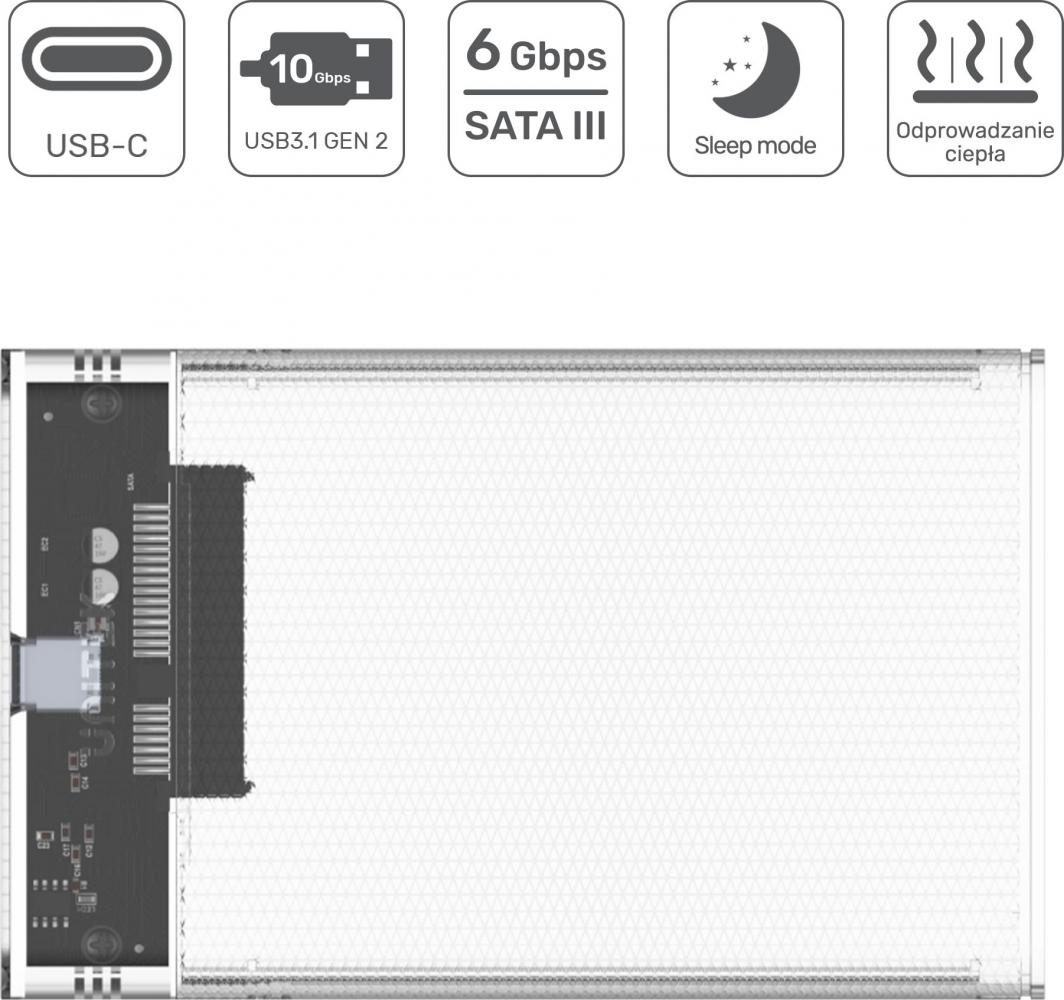 Obudowa jest kompatybilna ze wszystkimi typami dysków M.2: zarówno z interfejsem SATA jak i PCIe (NVMe). Do slotu pasują dyski z kluczem M key i M+B key o różnych długościach (42, 60, 80 mm). Do każdej długości płytki jest osobny zaczep, żeby była pewność, że dysk się nie poluzuje. Pomyślano także o trybie autosleep, co daje Ci oszczędność baterii notebooka i wydłużenie życia dysku.