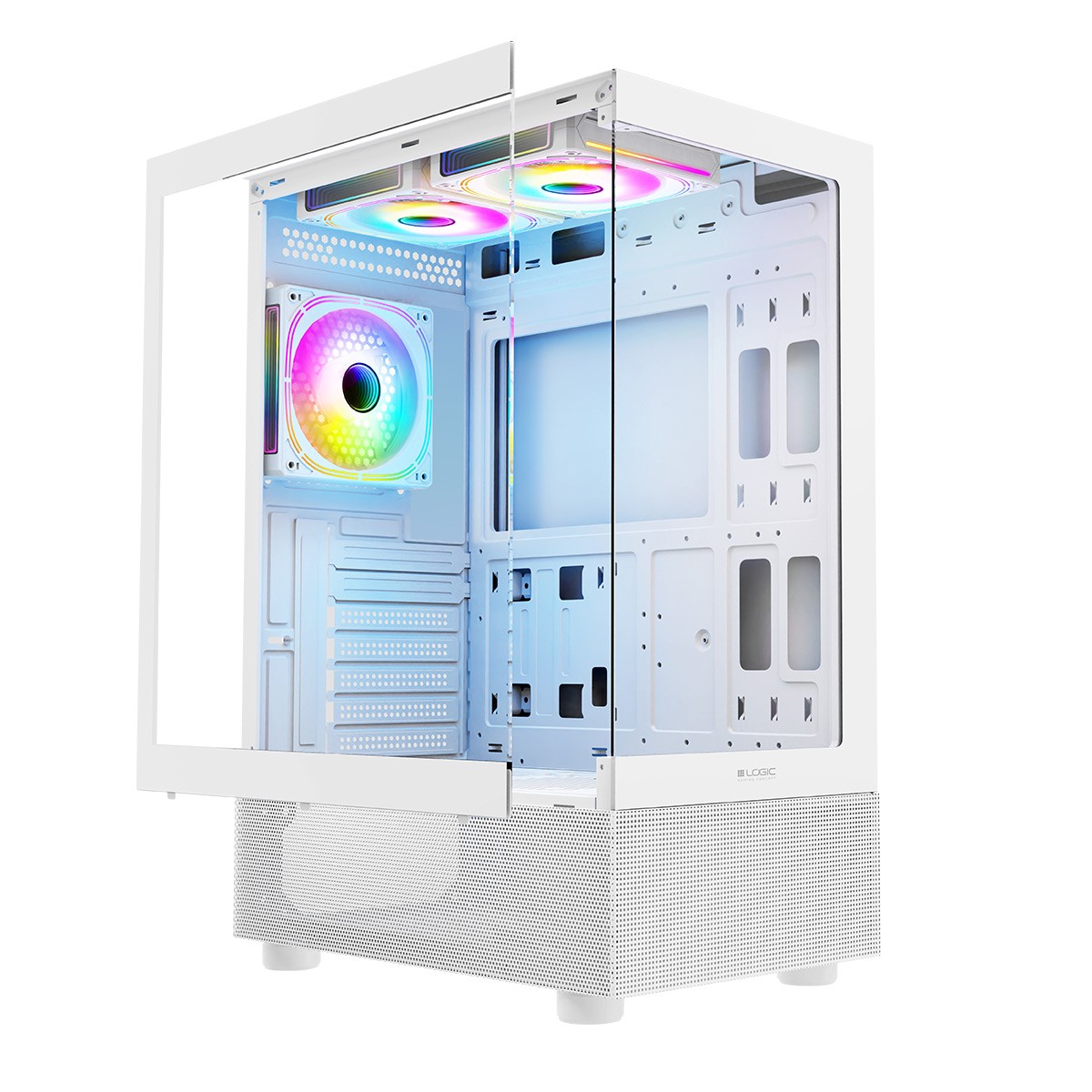 Dlatego jeżeli jesteś miłośnikiem podziwiania zakupionych elementów obudowa Logic Look jest dla Ciebie! Przeszklony panel boczny i przedni w najlepszy możliwie sposób eksponują całe wnętrze komputera. Jednak nie tylko estetyczne rozwiązania przemawiają za tą skrzynką. Są tu również zainstalowane trzy wentylatory 120 mm ARGB z kontrolerem obrotów, do tego złącze USB-C oraz przewiewne elementy w dolnej części konstrukcji, poprawiające obieg powietrza.