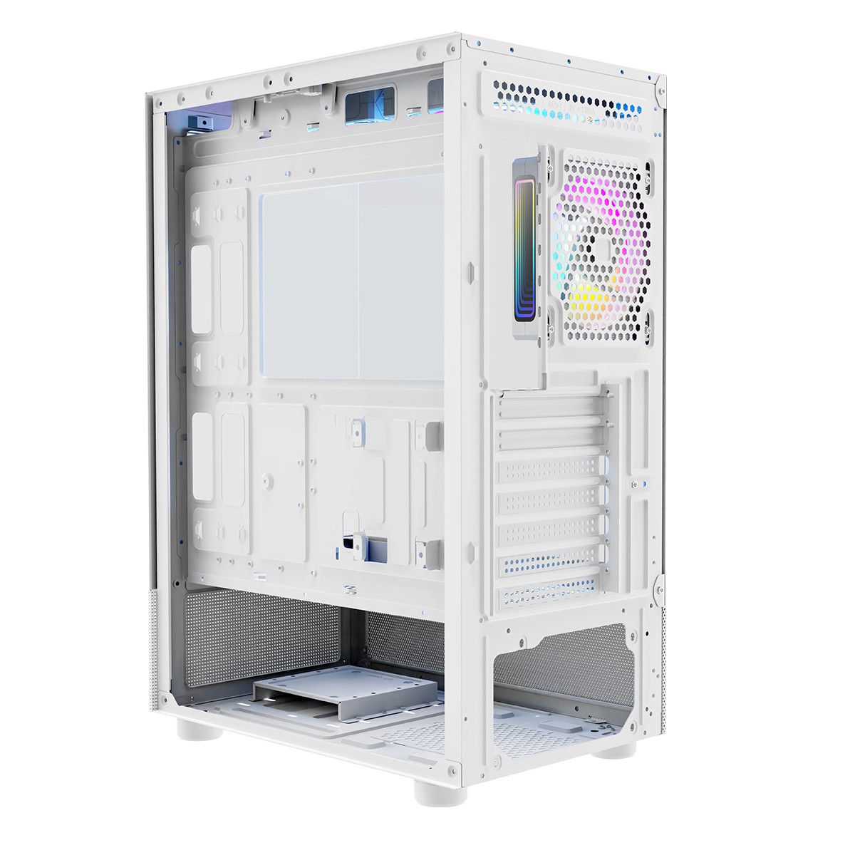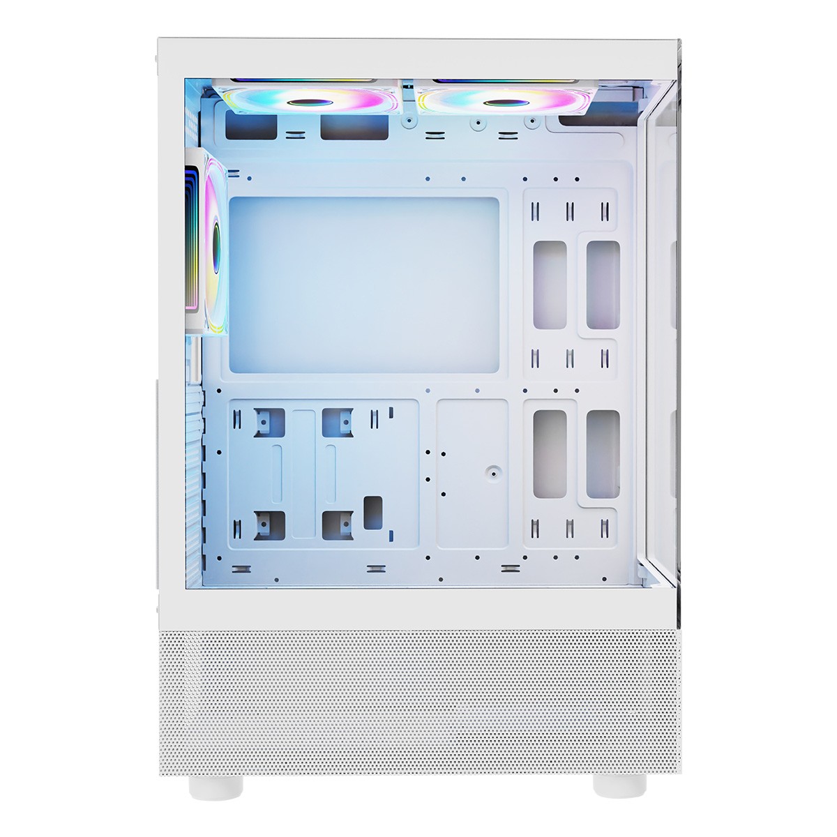 W obudowie zainstalowane zostały trzy 120 mm wentylatory ARGB. W celu zachowania jak najlepszego obiegu powietrza wentylator zamontowany z tyłu wyciąga gorące powietrze. Tak samo pracuje również jeden z wentylatorów na górze tuż nad procesorem. Drugi z kolei ten zamontowany najbliżej panelu przedniego wtłacza zimne powietrze do środka. Dzięki takiemu systemowi pracy, trzy wentylatory w najlepszy możliwie sposób chłodzą wnętrze komputera.