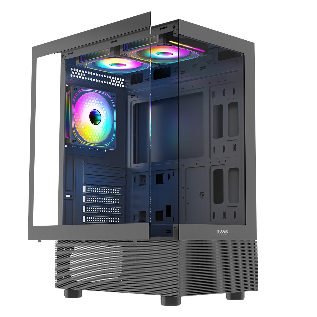 Dlatego jeżeli jesteś miłośnikiem podziwiania zakupionych elementów obudowa Logic Look jest dla Ciebie! Przeszklony panel boczny i przedni w najlepszy możliwie sposób eksponują całe wnętrze komputera. Jednak nie tylko estetyczne rozwiązania przemawiają za tą skrzynką. Są tu również zainstalowane trzy wentylatory 120 mm ARGB z kontrolerem obrotów, do tego złącze USB-C oraz przewiewne elementy w dolnej części konstrukcji, poprawiające obieg powietrza.