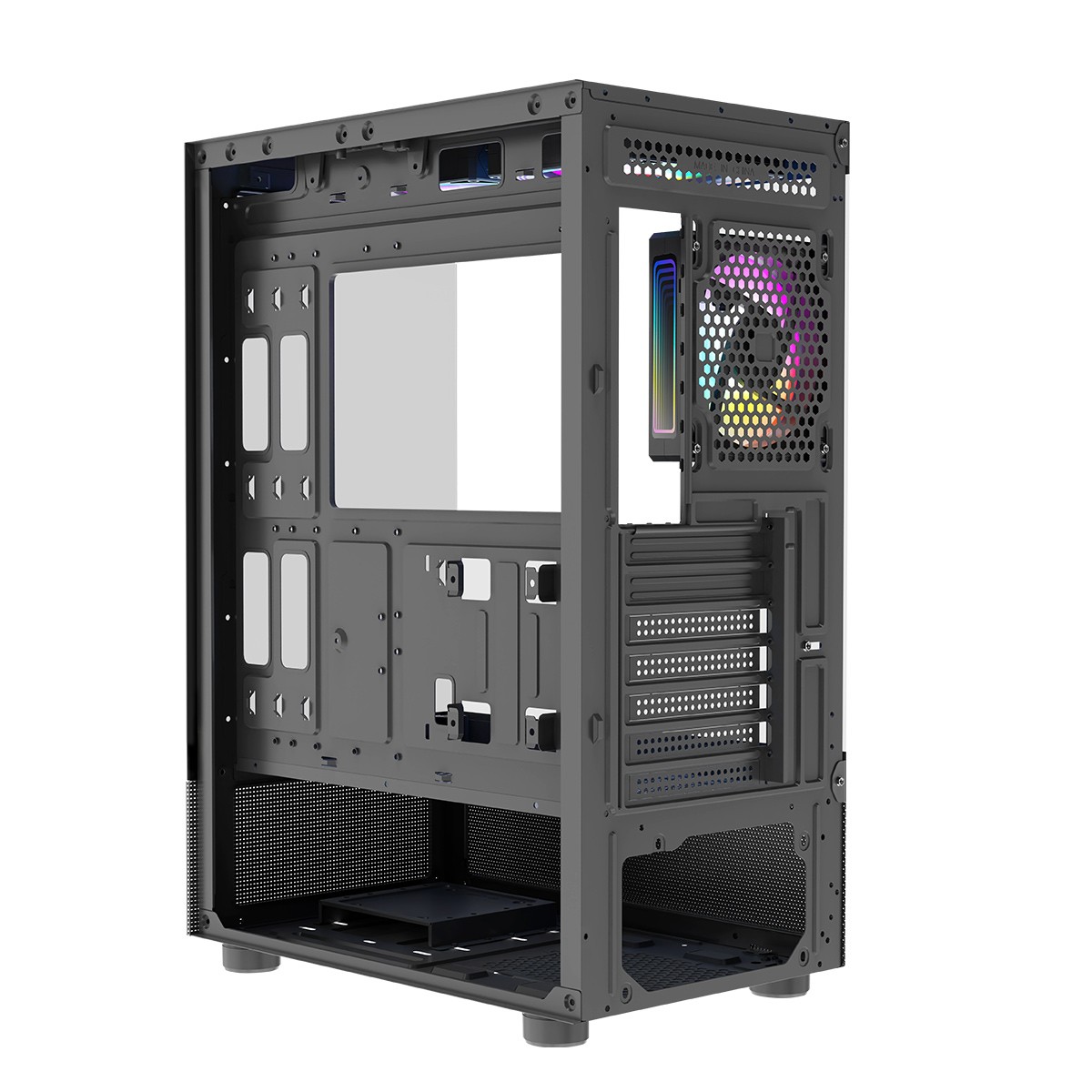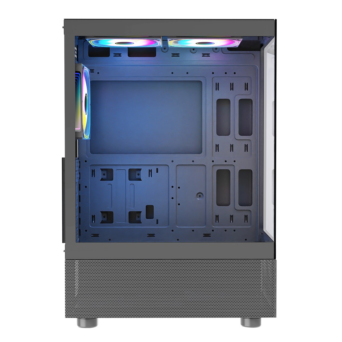 W obudowie zainstalowane zostały trzy 120 mm wentylatory ARGB. W celu zachowania jak najlepszego obiegu powietrza wentylator zamontowany z tyłu wyciąga gorące powietrze. Tak samo pracuje również jeden z wentylatorów na górze tuż nad procesorem. Drugi z kolei ten zamontowany najbliżej panelu przedniego wtłacza zimne powietrze do środka. Dzięki takiemu systemowi pracy, trzy wentylatory w najlepszy możliwie sposób chłodzą wnętrze komputera.