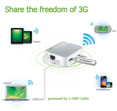 Dziel się wolnością 3G! Zasilany przez laptopa lub zewnętrzny zasilacz router TL-MR3020 umożliwia łatwe współdzielenie mobilnego połączenia 3G/3.75G z rodziną i przyjaciółmi na kampingu, w hotelu, wszędzie tam gdzie dostępna jest sieć 3G/3.75G. Podłączenie modemu USB 3G do routera umożliwia błyskawiczne utworzenie bezprzewodowego punktu dostępowego.