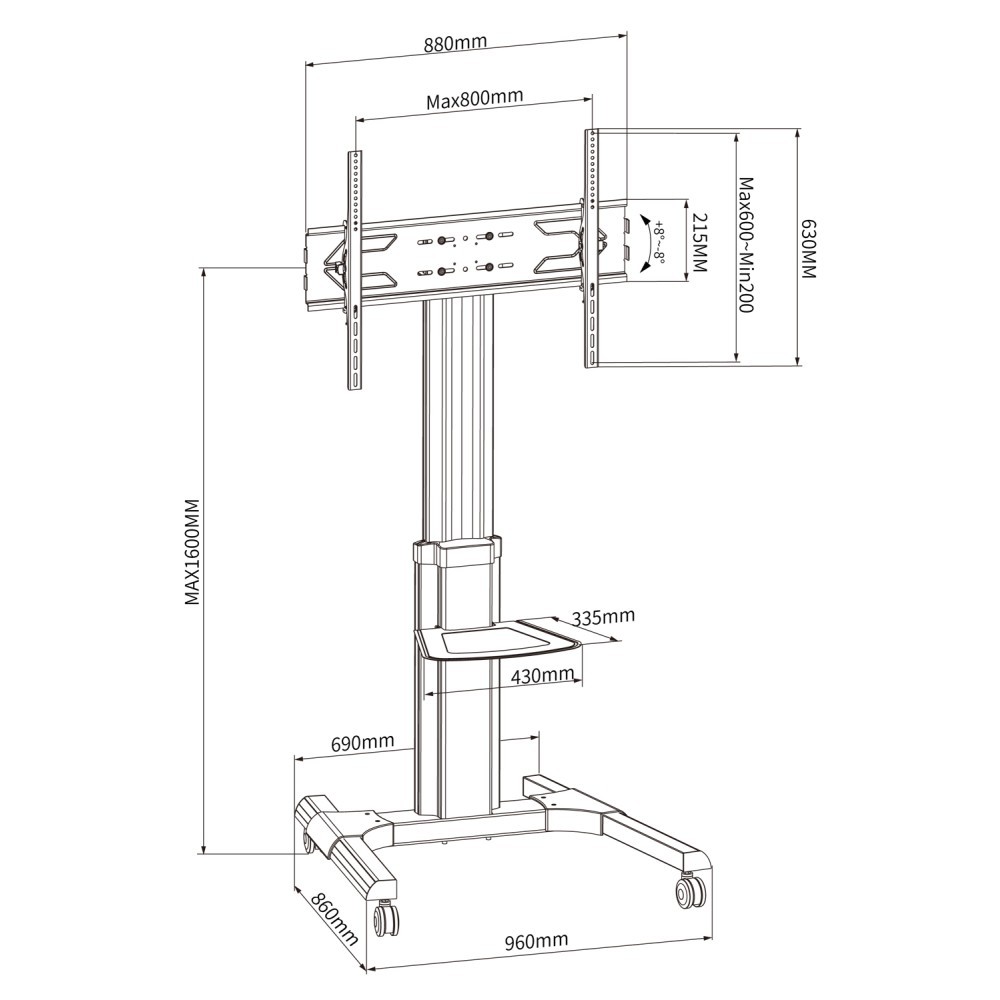 Wózek TV Techly ICA-TR156, PN: 366198 Mobilny Stojak na Telewizor lub Monitor LED/LCD 50 – 92 70kg, Regulacja Wysokości i Nachylenia, z Półką AV