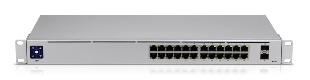 USW-24 to konfigurowalny przełącznik warstwy 2 z 24 portami Gigabit Ethernet i 2 portami SFP. Porty SFP zapewniają opcje łącza światłowodowego 1 Gb / s do sieci firmowej. USW-24 ma 1,3-calowy ekran dotykowy, niewielkie rozmiary i konstrukcję bez wentylatora. Ekran dotykowy wyświetla aktualny stan przełącznika i informacje umożliwiające szybką diagnostykę.