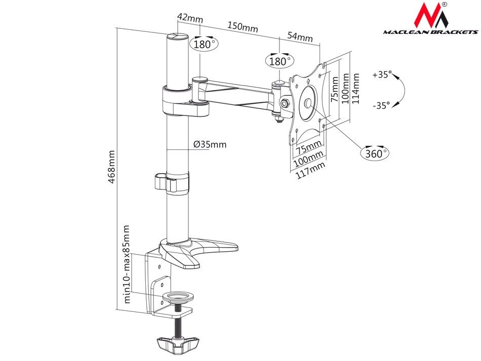 • Do uchwytu bez problemu przymocujemy ekran w standardzie VESA: 75×75, 100×100