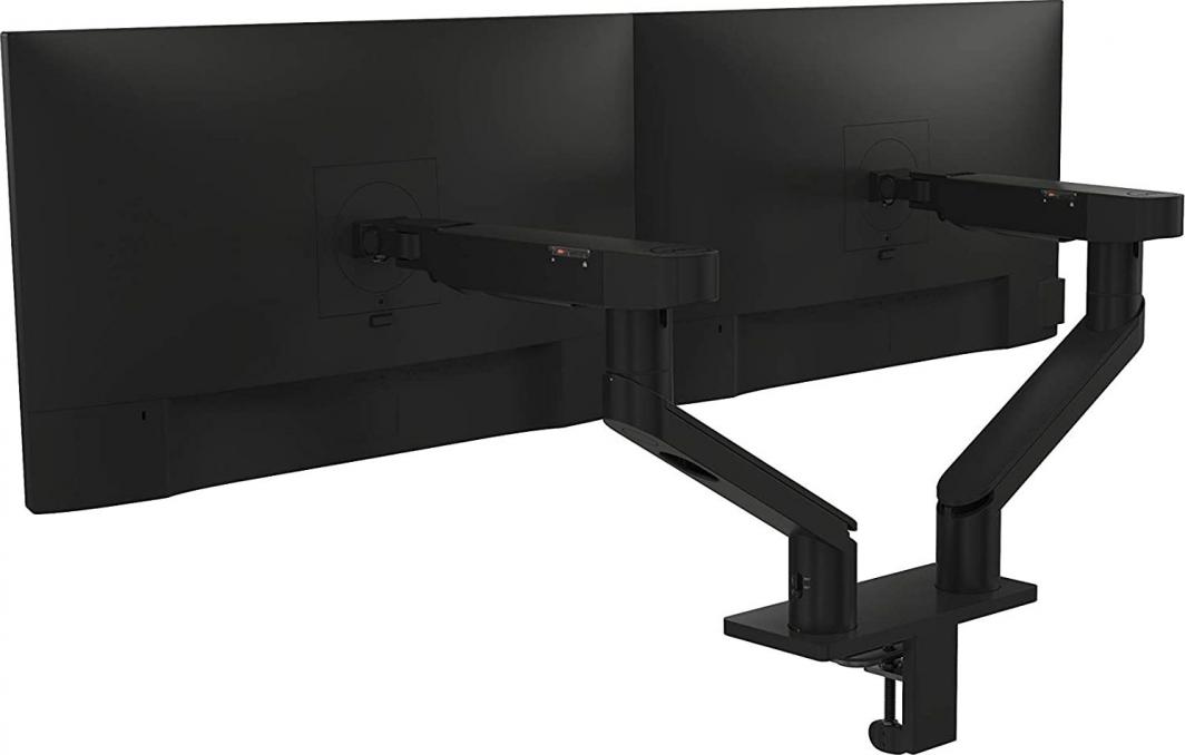 Regulacja wysokości, nachylenia, obrotu, głębokości i obrotu ułatwia indywidualne przesuwanie monitorów na tym podwójnym ramieniu monitora do preferowanej konfiguracji monitora.