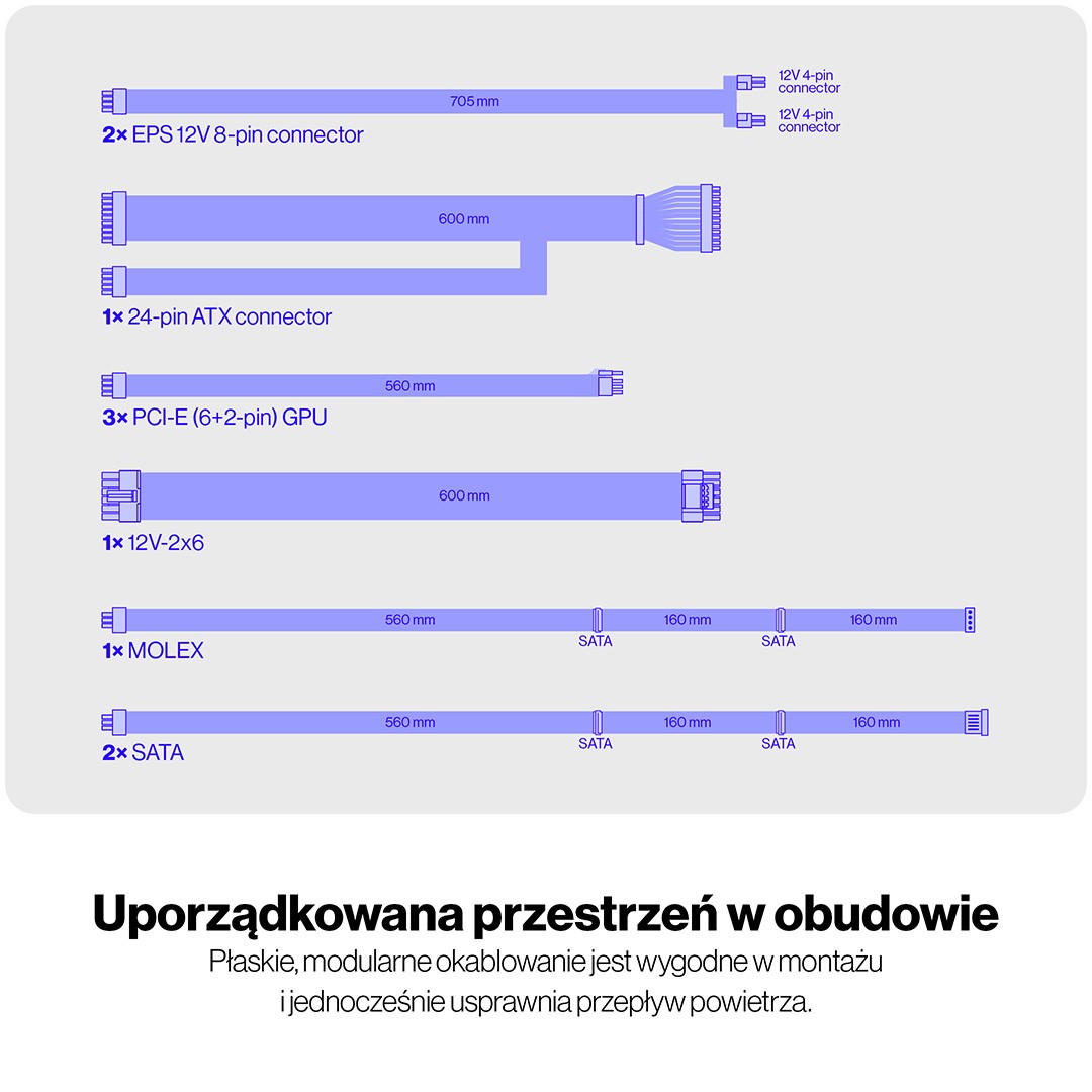 Nie musisz myśleć o wiązkach niewykorzystanych przewodów. W pełni modularne okablowanie pozwala na podpięcie tylko tych, które będą Ci potrzebne. Poza wygodniejszym procesem układania kabli, umożliwia to uporządkowanie przestrzeni w obudowie, dzięki czemu poprawia się przepływ powietrza i temperatura.