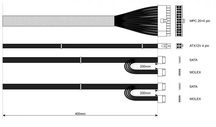 Został wyposażony w złącze zasilania P4 4pin, 2 złącza MOLEX, 2 złącza SATA oraz uniwersalne 24pin do płyt głównych. Efektywne chłodzenie zapewnia czterocentymetrowy, cichy wentylator o automatycznej regulacji obrotów. Zasilacz charakteryzuje się wysoką sprawnością powyżej 70%. Wykonany został z wytrzymałej, ocynkowanej galwanicznie stali.