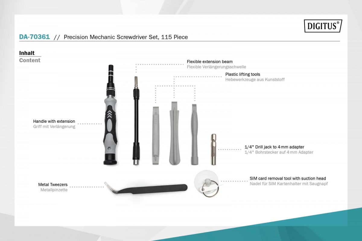 115 części do szerokiej gamy różnych zastosowań w mechanice precyzyjnej. Dzięki dwustronnej kasecie zestaw jest kompaktowy, a jednocześnie dobrze uporządkowany